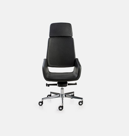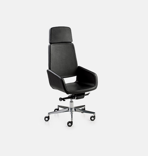 Sillon alto completamente tapizado giratorio con cabecero, base en aluminio pulido, brazos integrados en el modelo y mecanismo avanzado.