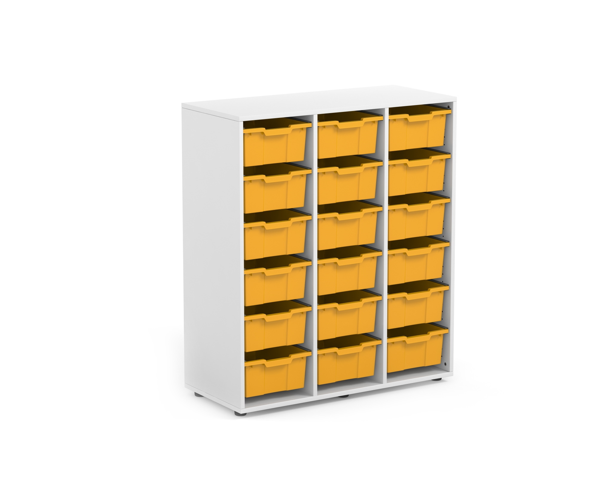Armario escolar con espacios interiores y capacidad para cubetas.