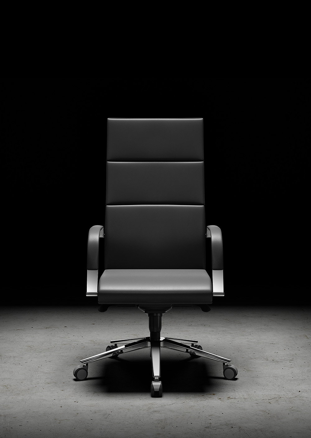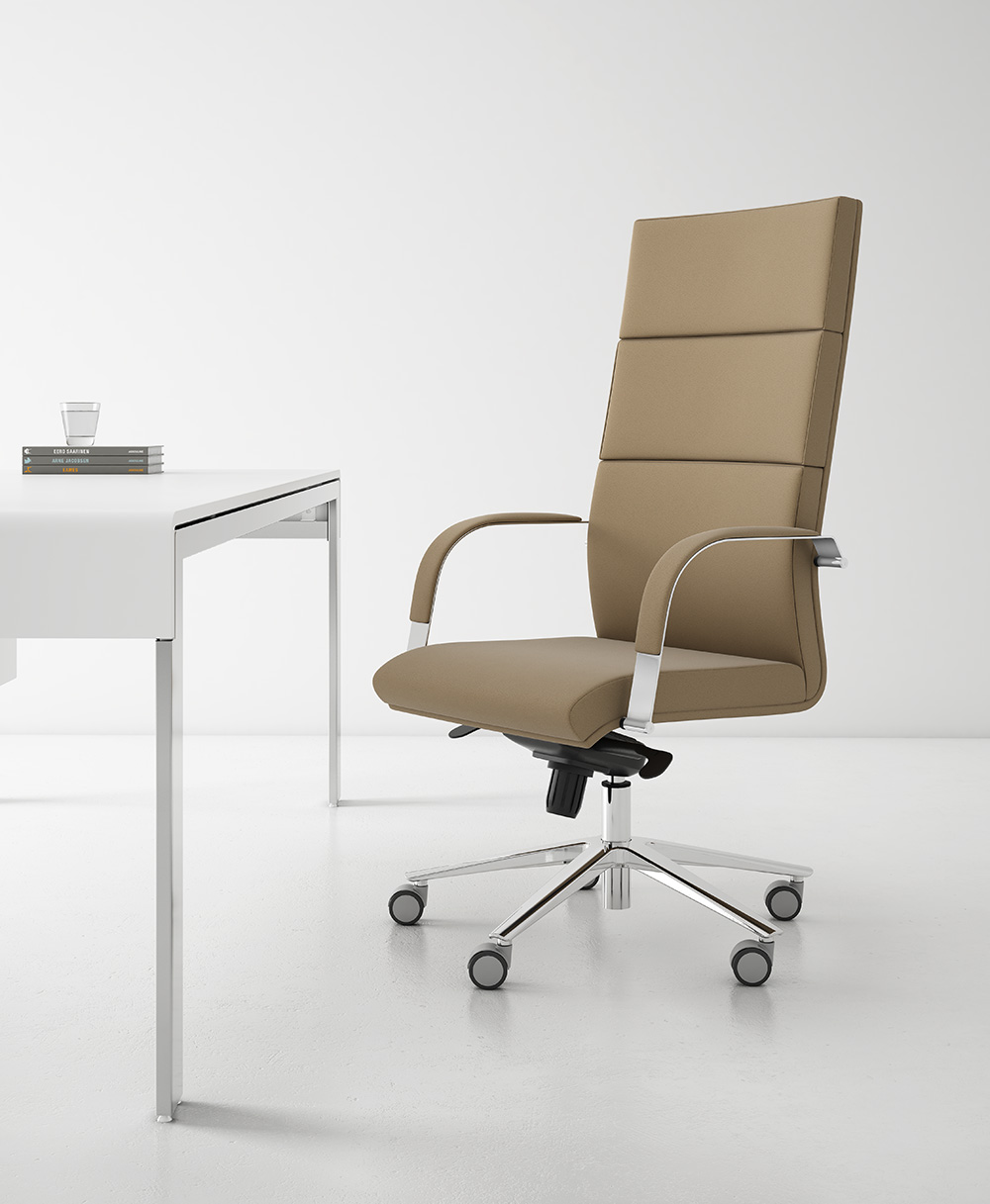 Sillón direccional de respaldo alto con monocarcasa de haya tapizada.