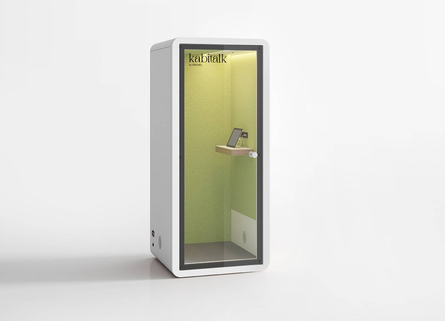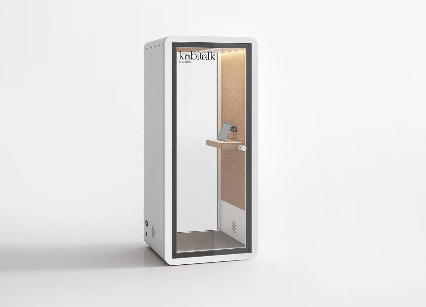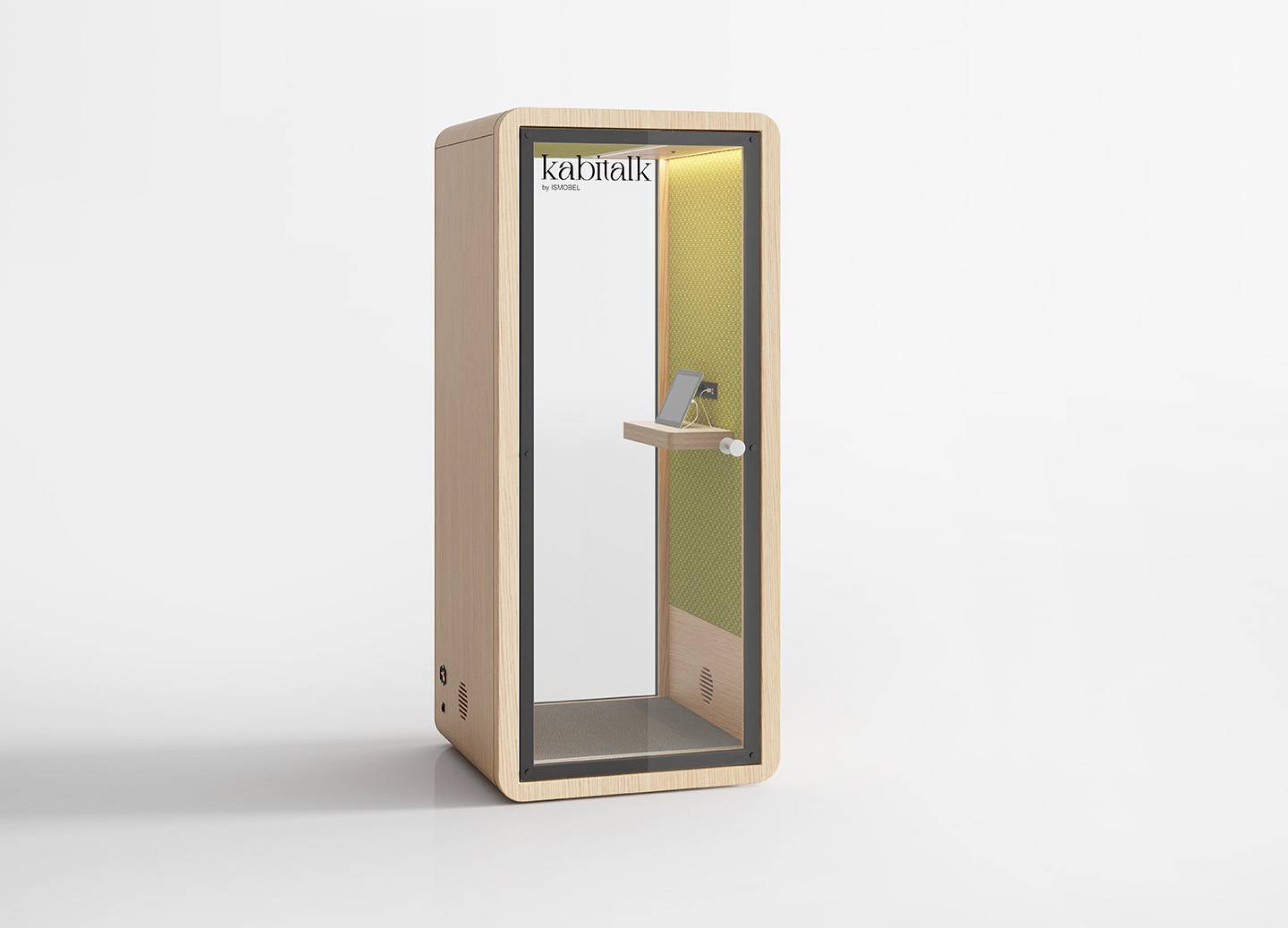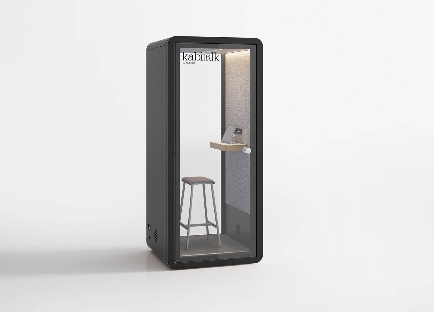 Cabinas de oficina para una concentración óptima, con una puerta de cristal que asegura aislamiento acústico sin sacrificar la visibilidad. Equipadas con iluminación LED, mesa extra ancha y toma de corriente, se adaptan perfectamente a cualquier entorno gracias a su diseño sencillo.