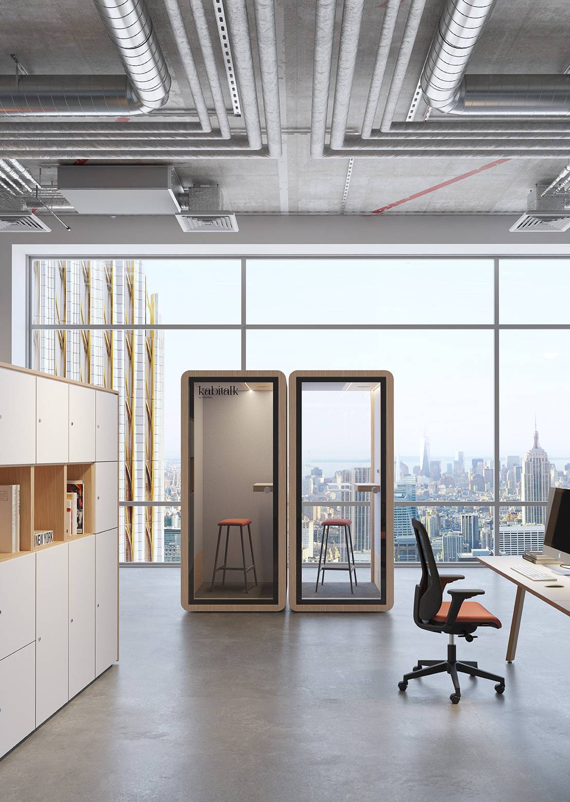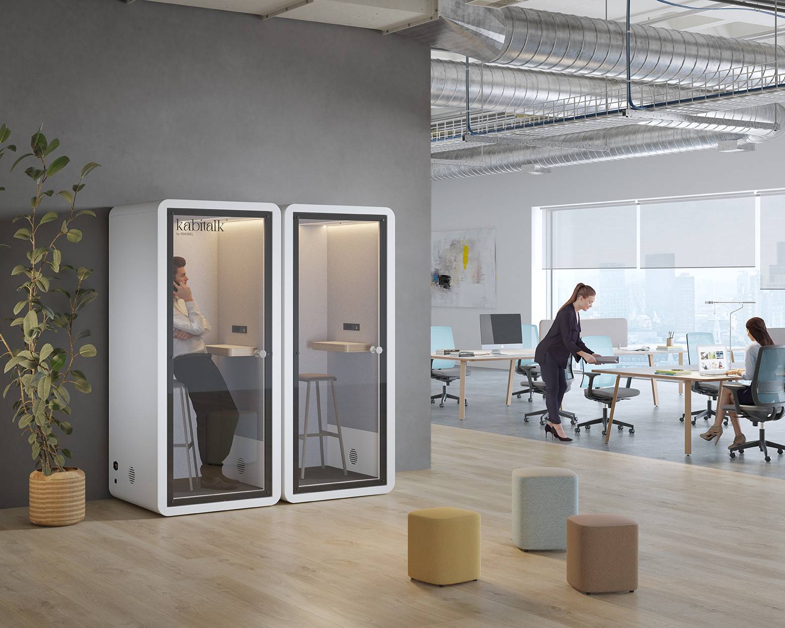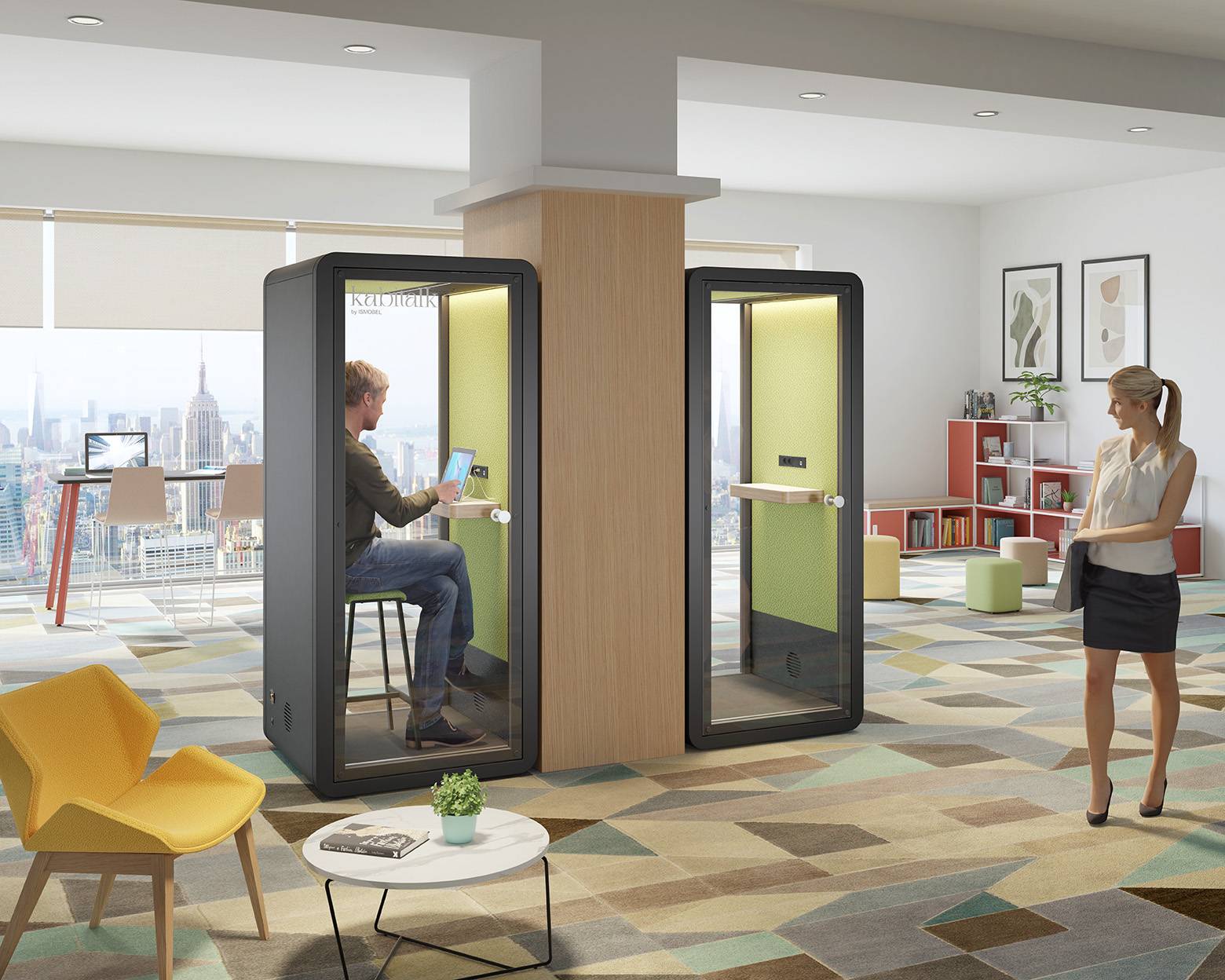 Perfectas para cualquier ambiente laboral, estas cabinas modernas y sofisticadas destacan por su diseño minimalista, interiores generosos y una selección variada de colores, tejidos y mobiliario elegantes.