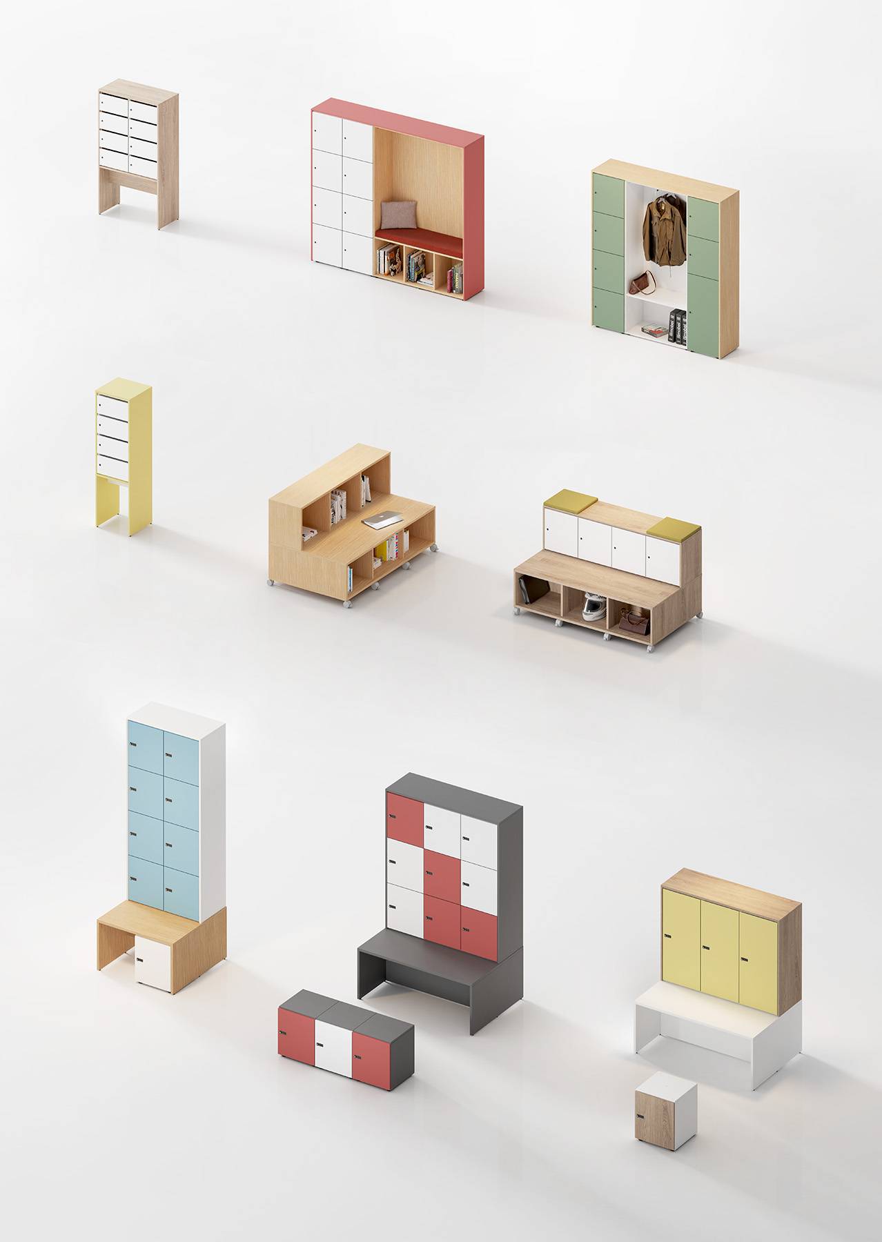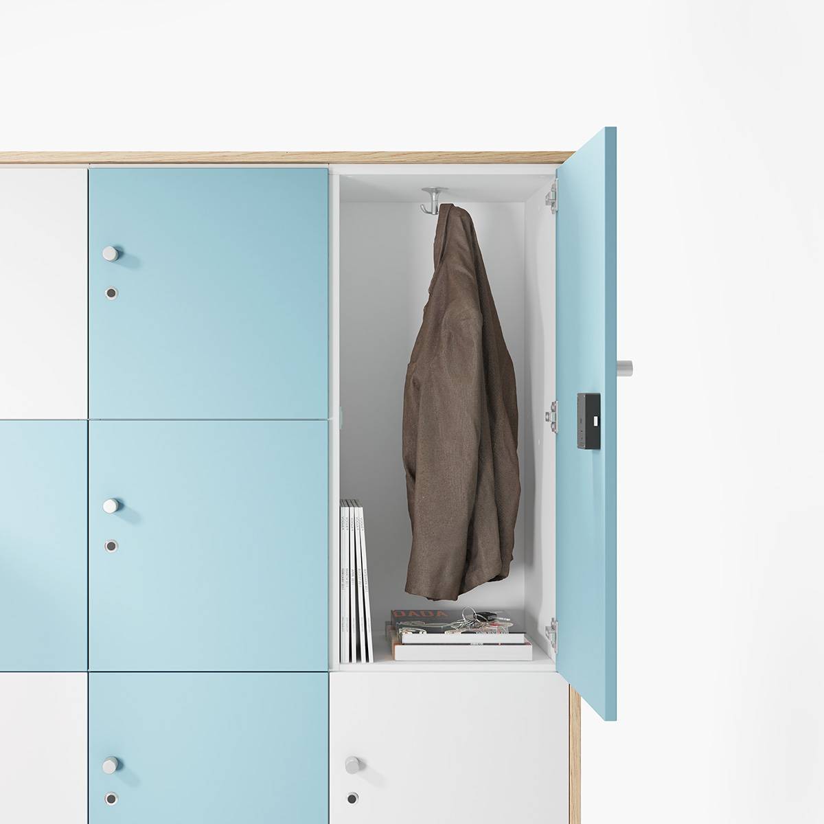 El cuerpo de las taquillas y los percheros se sirve siempre en color blanco, negro, gris o grafito. Para el resto