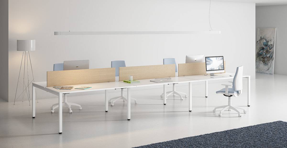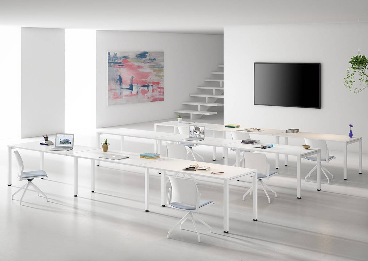 Una mesa colectiva, para hacer que tu espacio de trabajo se amolde a tus necesidades gracias a su estructura monoviga compuesta por un juego de pórticos y viga central.