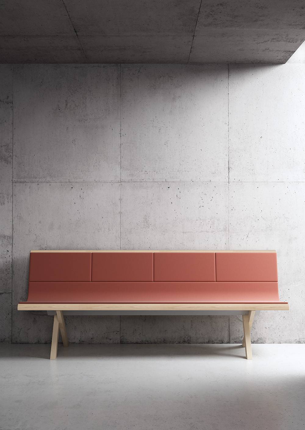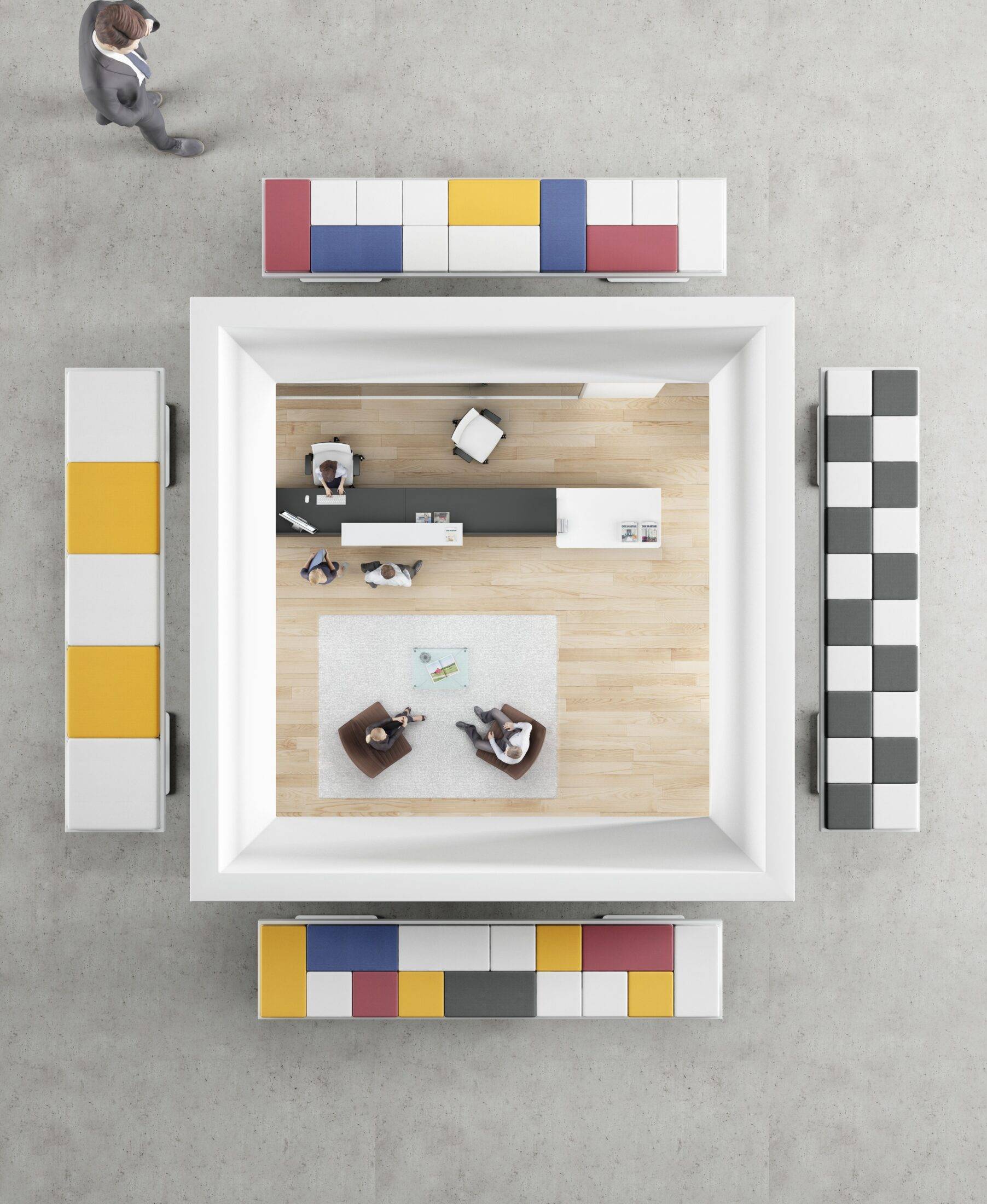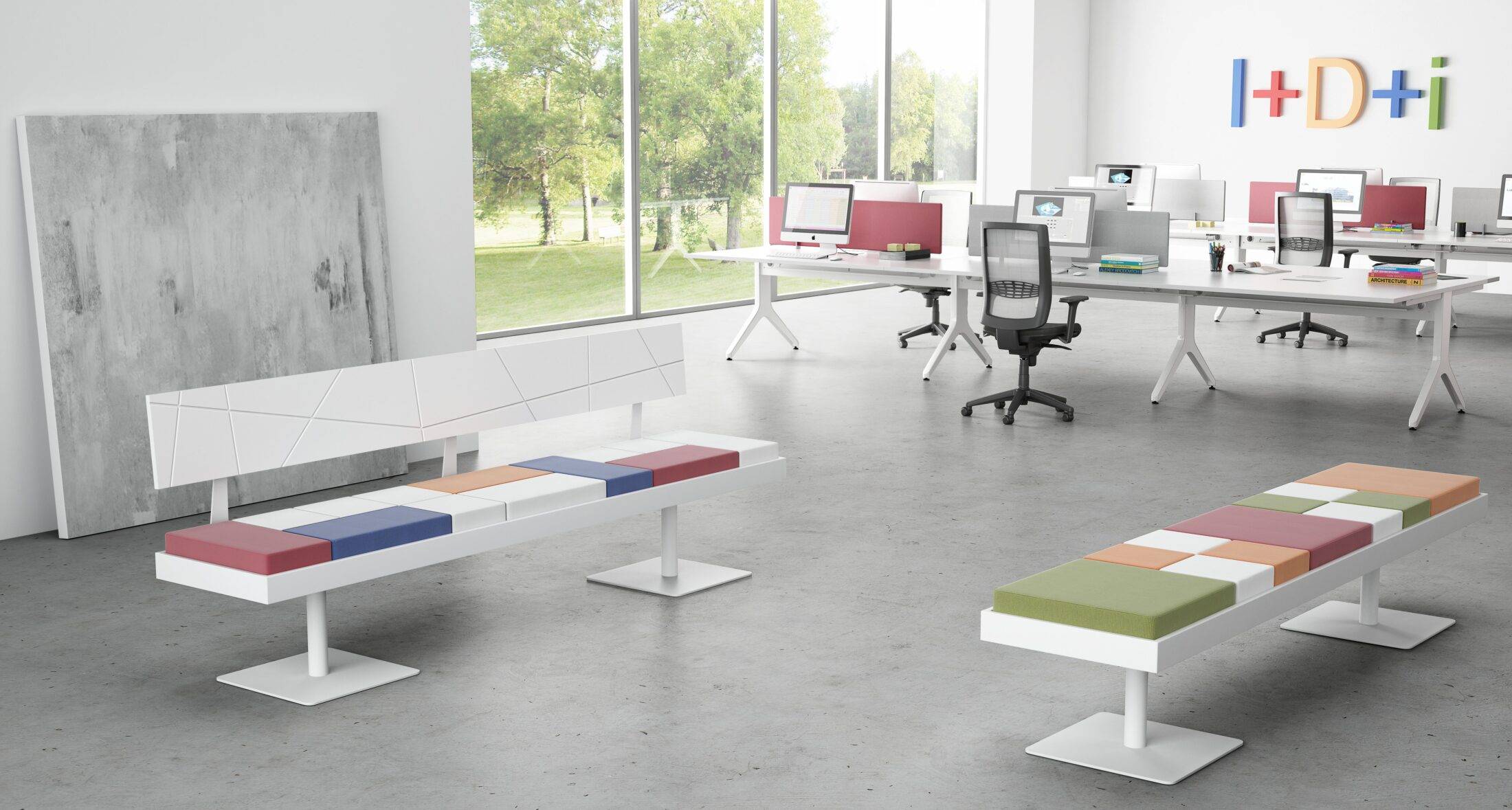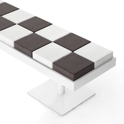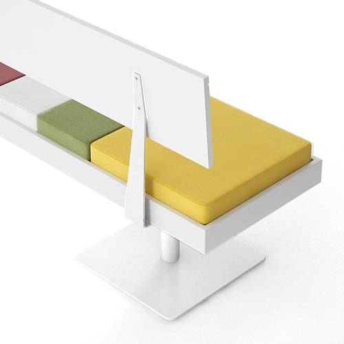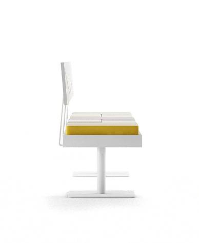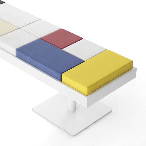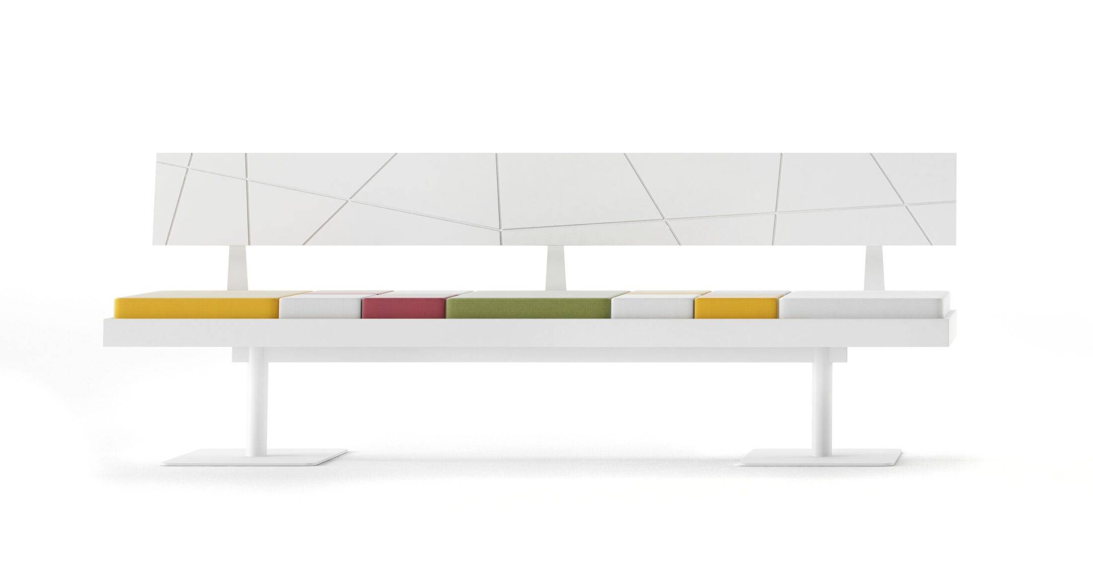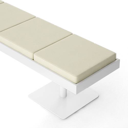 Venecia es un banco de espera con asiento fabricado en DM lacado blanco con tres tamaños de cojines fabricados con espuma, tapizados en acabado GOYA e intercambiables entre sí.